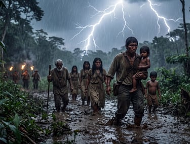Las nubes se oscurecieron como si el mundo cerrara los ojos, los rayos abrieron caminos de luz, los truenos rugieron como jaguares celestes y una lluvia torrencial cubrió la tierra. Era la naturaleza misma, reconociendo a sus hijos, protegiendo su huida.