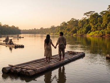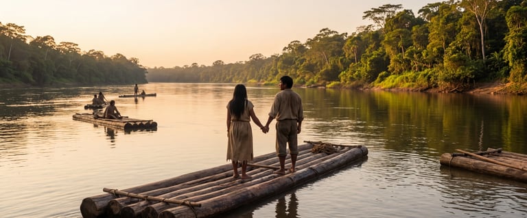 Llegaron al río Angusilla, y con balsas hechas de sabiduría y urgencia, atravesaron el gran río Putumayo. Allí la selva los recibió como hijos que regresan. Habitaron distintos lugares —Puntales, Cajones, hoy Isla Nueva— hasta que el abuelo Lorenzo y su linaje se asentaron definitivamente en el río Caucayá, donde nacería la comunidad de Cecilia Cocha.